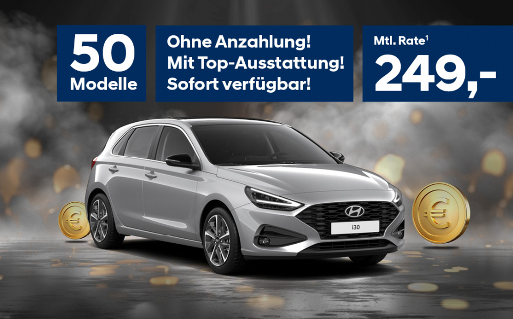 Top-Deals und Bargeld für deinen Alten! Der neue Hyundai i30 Advantage für nur 249 €1 im Monat – ohne Anzahlung - mit Top-Ausstattung - sofort verfügbar und den Wert deines Gebrauchtwagen zahlen wir auf Wunsch in bar aus.